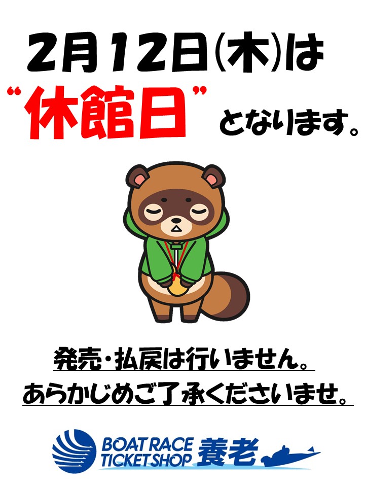 発売・払戻は行いませんので、あらかじめご了承ください。なお、2月13日(金)は通常どおり朝9時より営業いたします。
