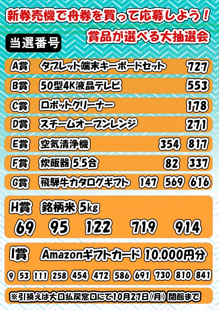 【当選番号発表】新券売機で舟券を買って応募しよう!賞品が選べる大抽選会 2025.10.13 新着情報・イベント 【新券売機で舟券を買って応募しよう!賞品が選べる大抽選会 当選番号発表】 10月3日(金)~13日(月・祝)に実施しました、大抽選会の当選番号を発表いたします。 当選番号は以下のとおりです。 賞品引換期間:10月27日(月)閉館まで 賞品引換場所:10月13日(月・祝)18:30までは一般席特設ブース。以降、大口払戻窓口にて たくさんのご応募ありがとうございました。 前の記事へ 一覧へ戻る