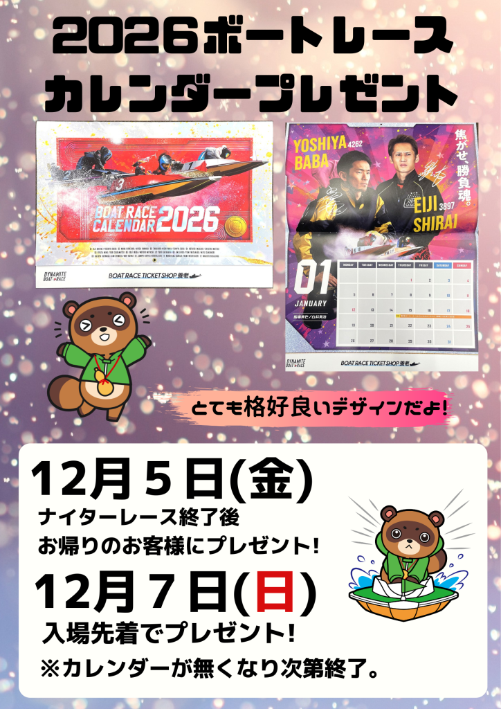 毎年、大好評のBOATRACEカレンダー2026年verを以下の日程でプレゼントします。